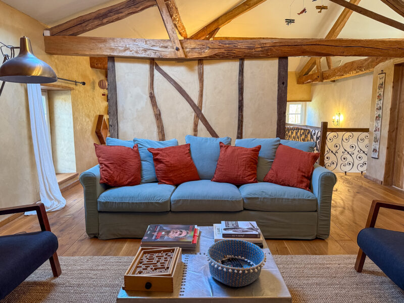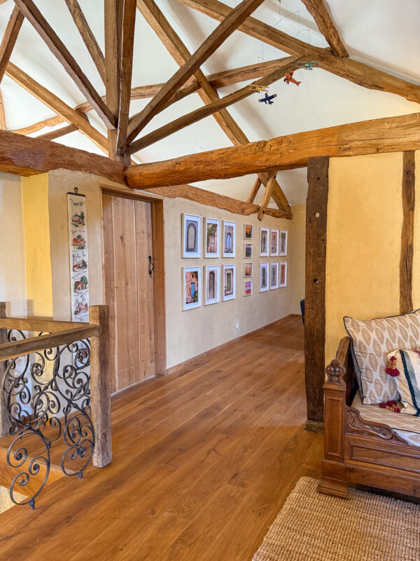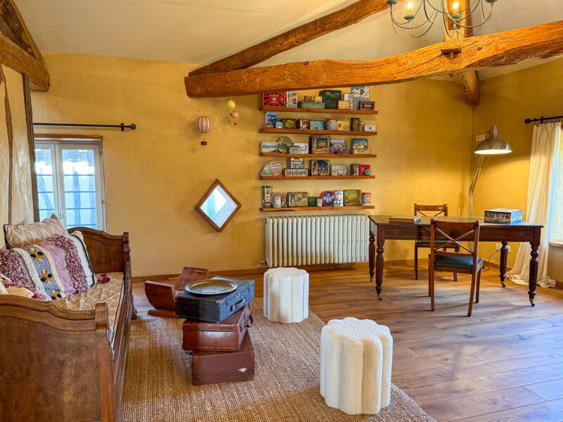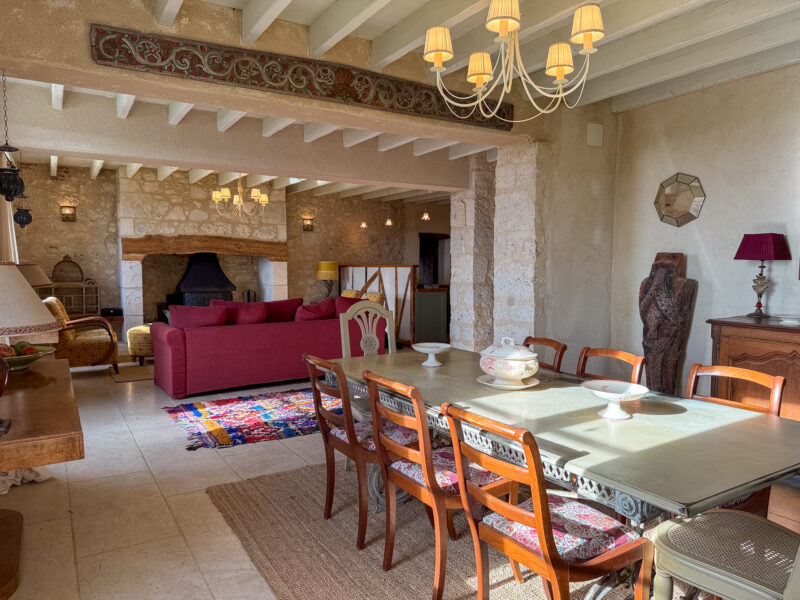 From the entrance hall, a straight stone staircase rises to the first floor, opening into an impressive room of nearly 50 sqm, filled with natural light from several windows and rooflights. An original half-timbered partition subtly divides the space into a study area on one side and a TV lounge on the other. Light wood flooring and an exposed roof structure combine to create a warm and inviting atmosphere.