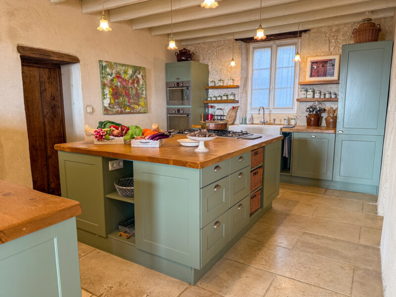Beautifully designed and fully fitted, the kitchen features a large central island and a white ceramic, Butler-style sink.