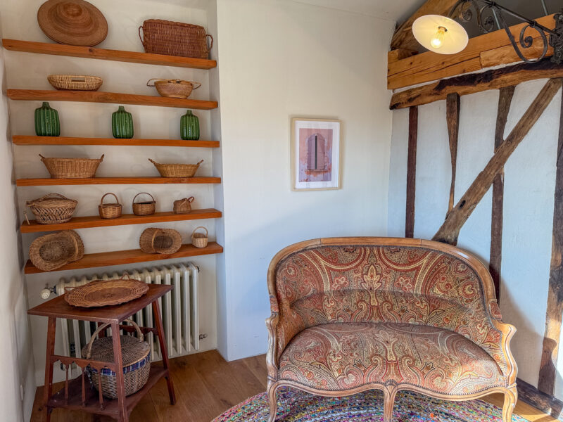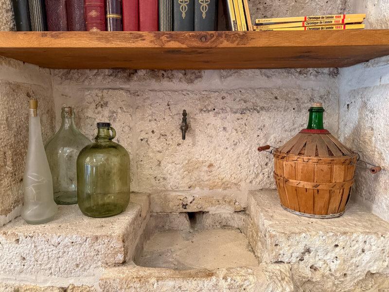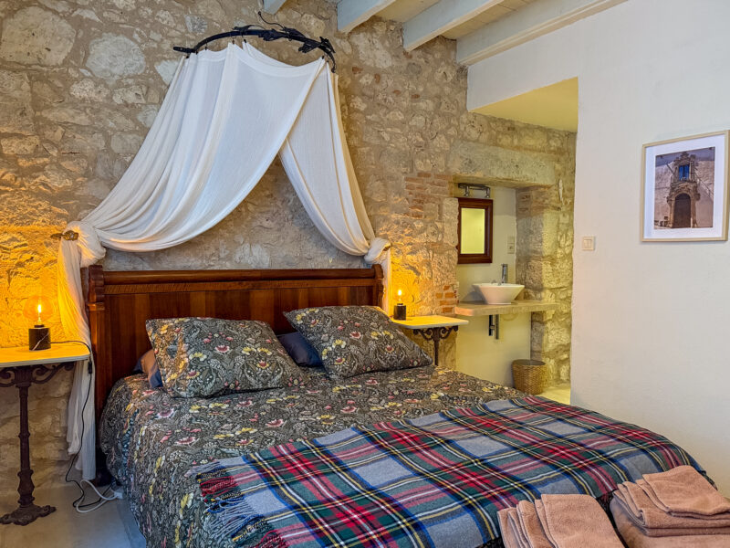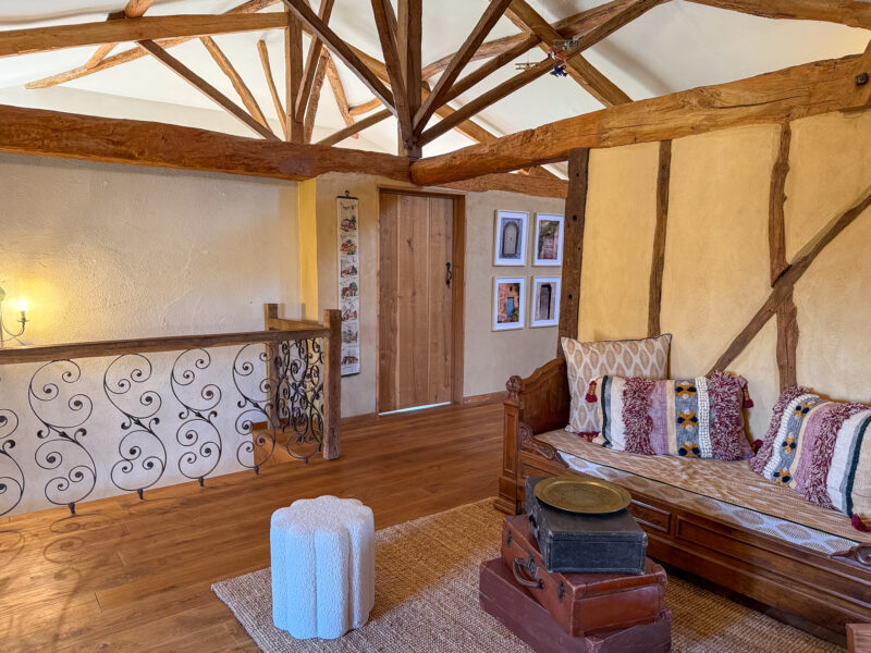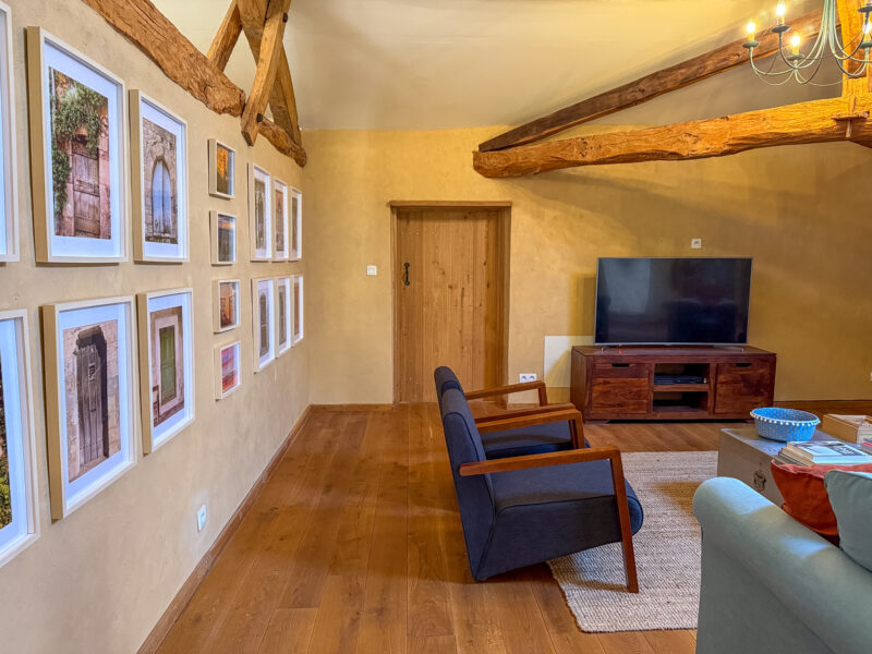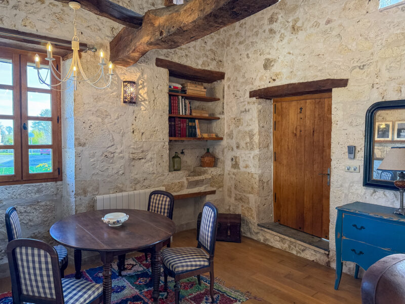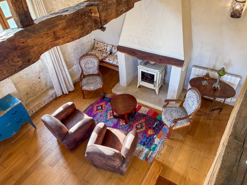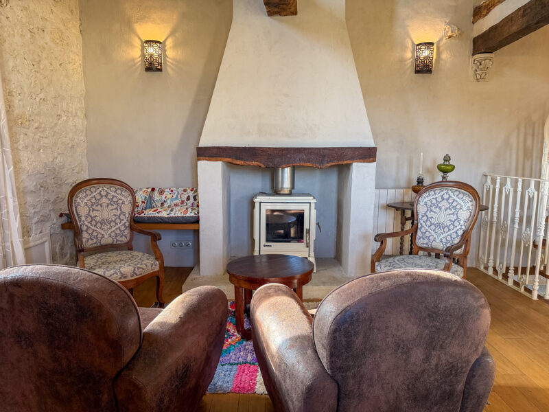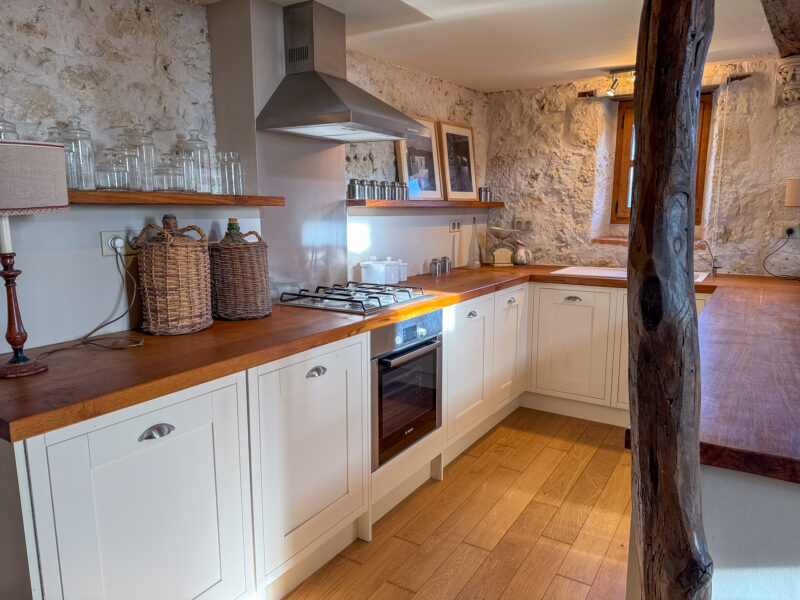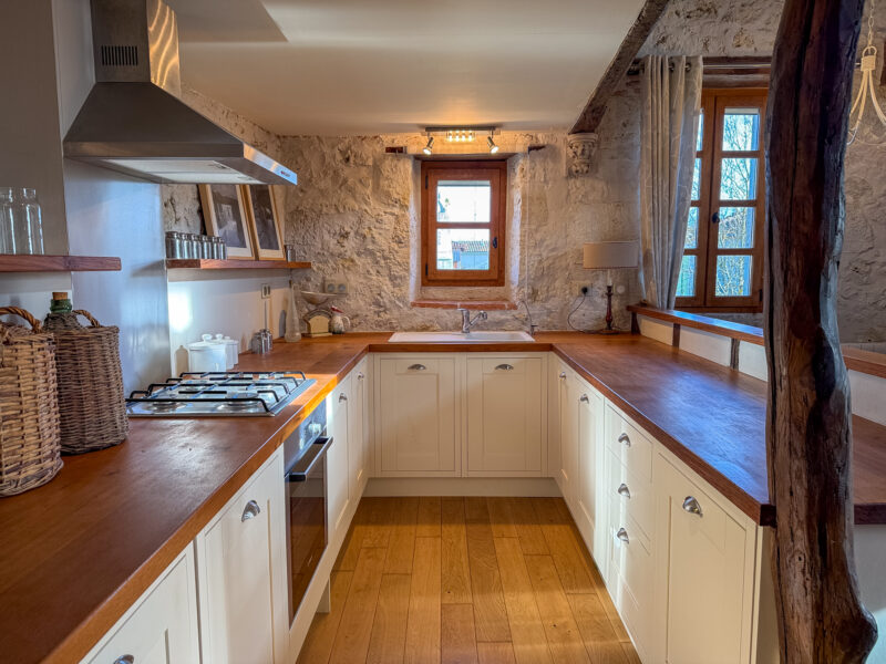 The front door opens into a room of approximately 34 sqm comprising a sitting/dining area with a wood-burning stove and a fitted, open-plan kitchen. The generous ceiling height, beautiful beams, exposed stone walls, original sink and light wood flooring all contribute to the warm and unique character of the space.