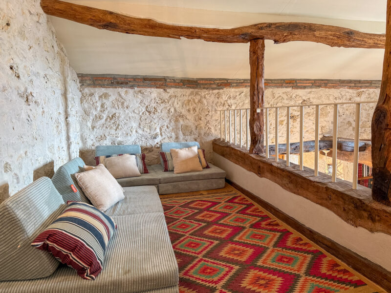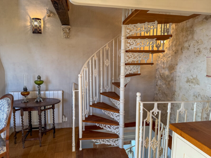 A beautifully crafted spiral staircase tucked into one corner leads up to a large mezzanine overlooking the living area, which could be used as a reading nook, occasional sleeping area or home office.