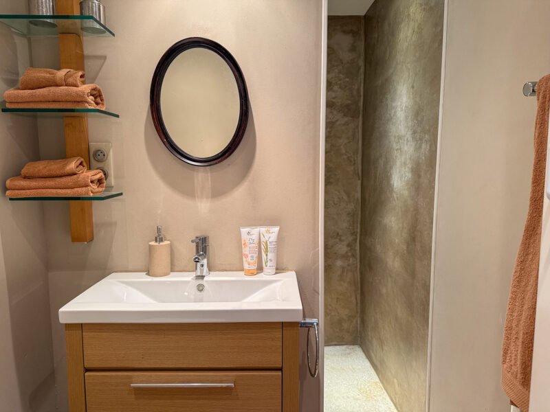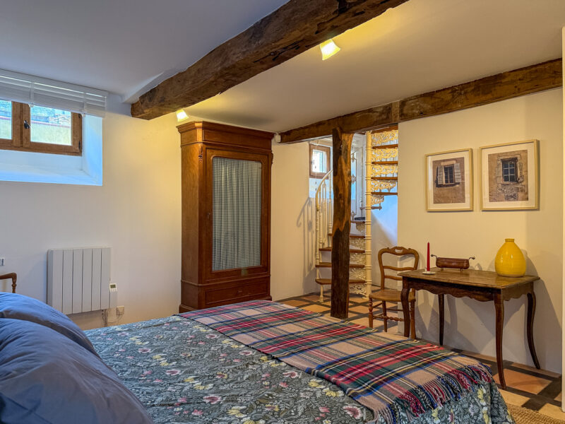 The staircase also leads down to a lower level housing a bright bedroom and a shower room. A notable feature of this bedroom is its direct access to the outside and the village.