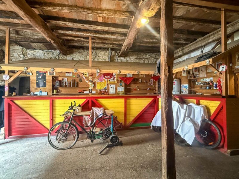 There are three large windows and big double doors. The original stone walls add authenticity to the space.