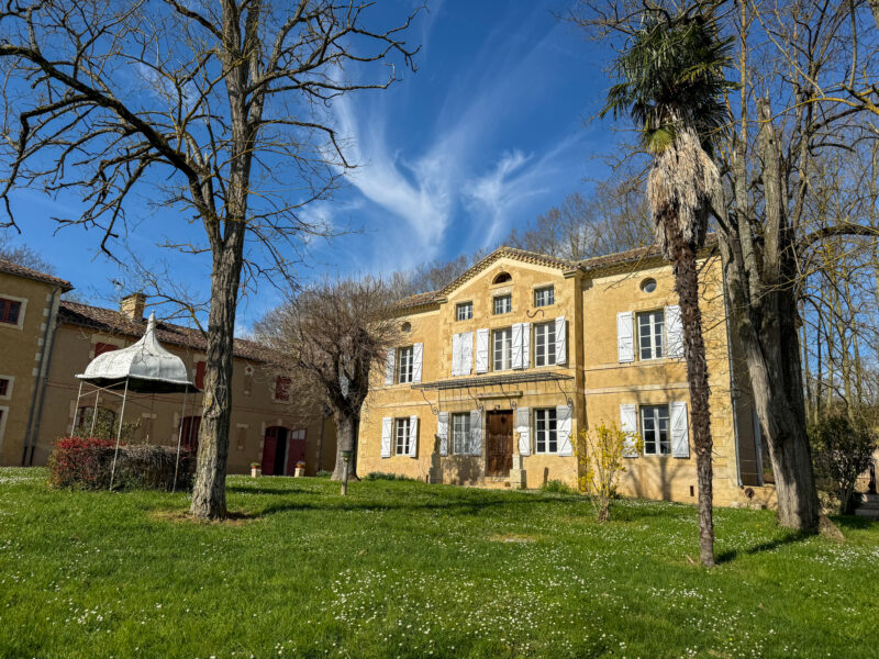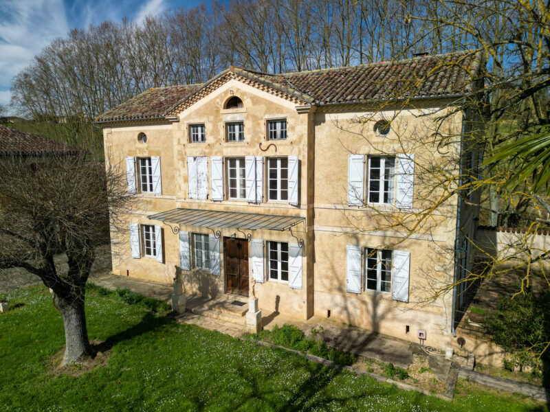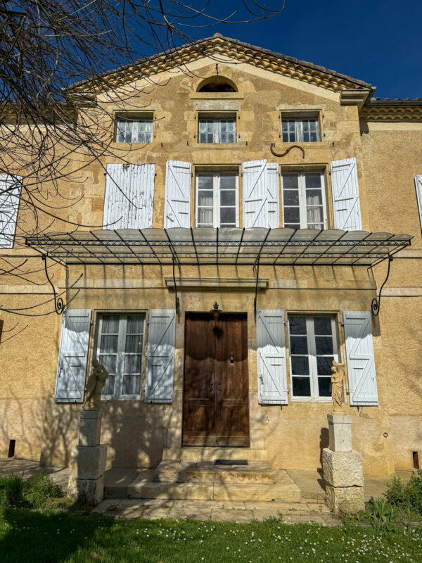 Set slightly apart from a village, this beautiful Gascon maison de maître reveals a perfectly symmetrical façade finished in pale render. The front door is crowned with an elegant canopy, while nine large windows line the ground and first floors, complemented by two oculi and three small upper windows punctuating the top level.