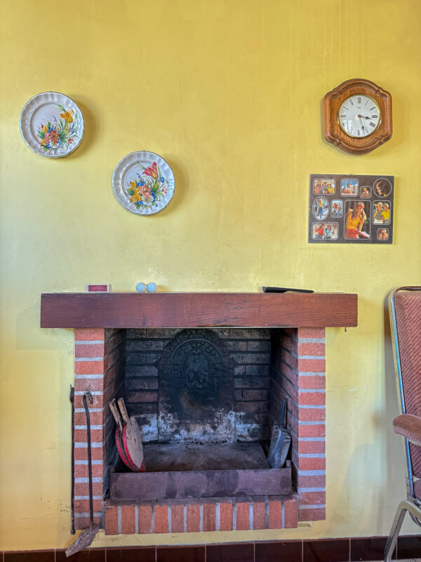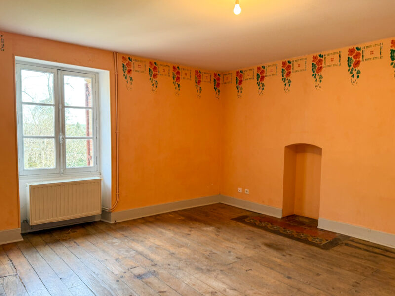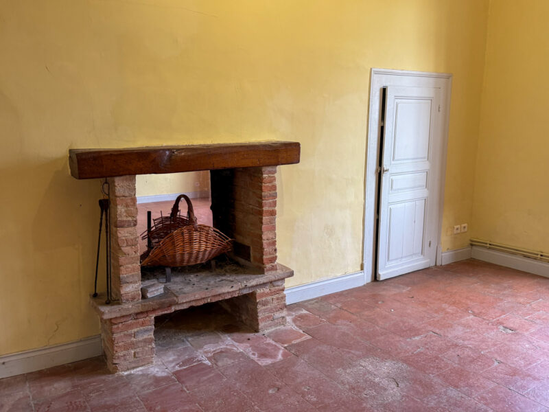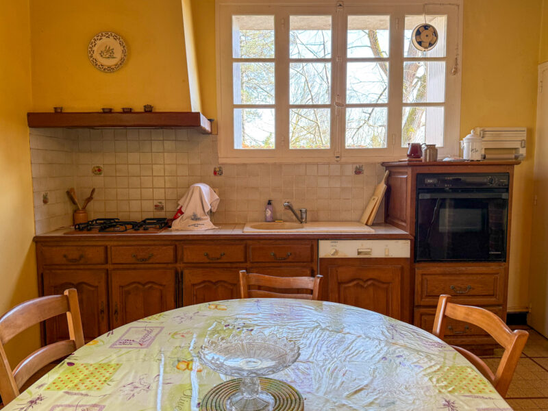 The kitchen, located at the rear of the house and directly accessible from the dining room, measures approximately 22 m². It is bright, with two large windows and French doors opening onto the outside, and features a brick fireplace and built-in storage.