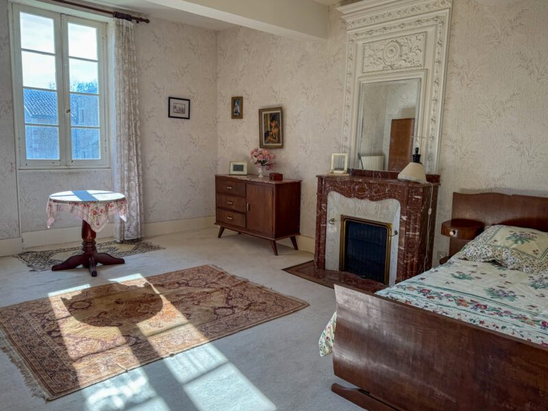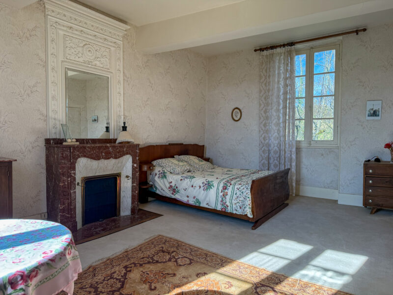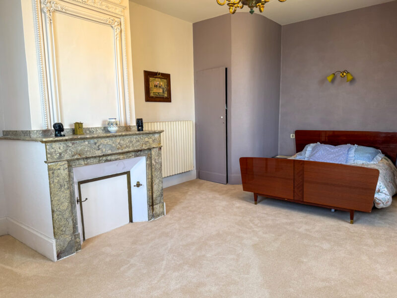 The master bedroom, nearly 27 m², benefits from dual-aspect light and retains a period marble fireplace topped with an elegant overmantel.