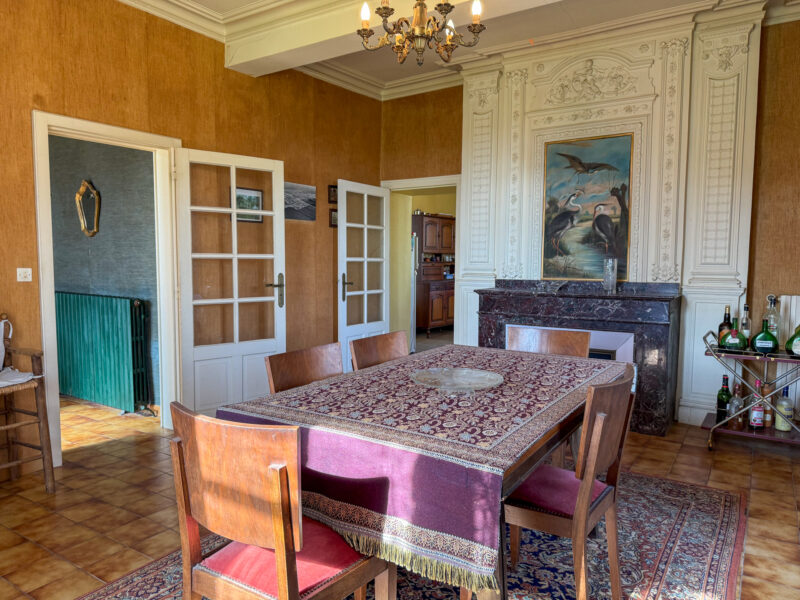 Opposite, the dining room of approximately 25 m² offers generous proportions and two openings, including French doors leading to the terrace. Here again, a decorative fireplace is enhanced by a finely detailed plaster overmantel with pilasters and frieze.