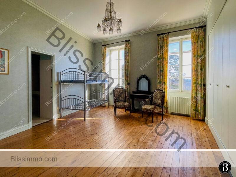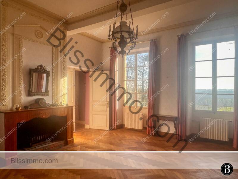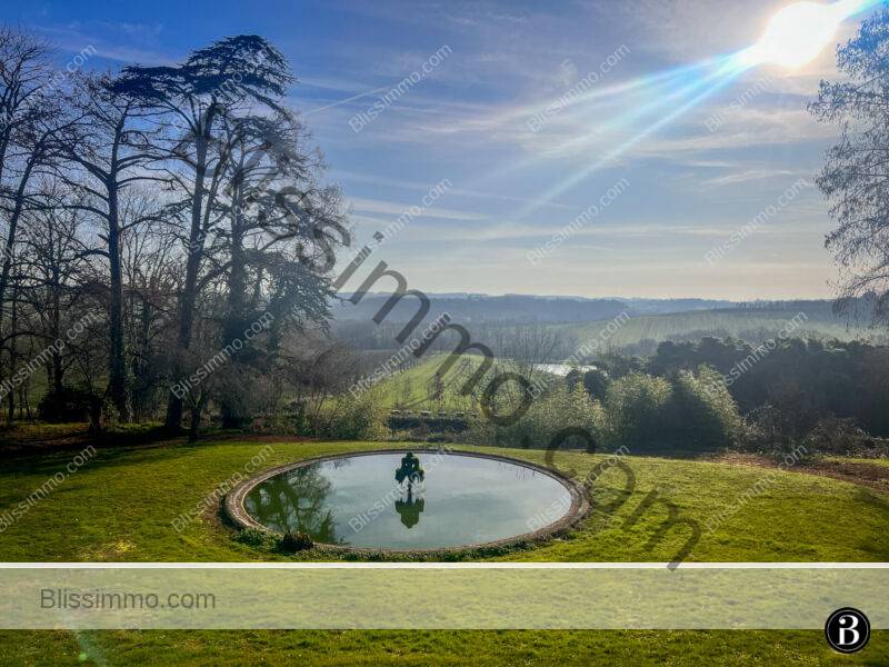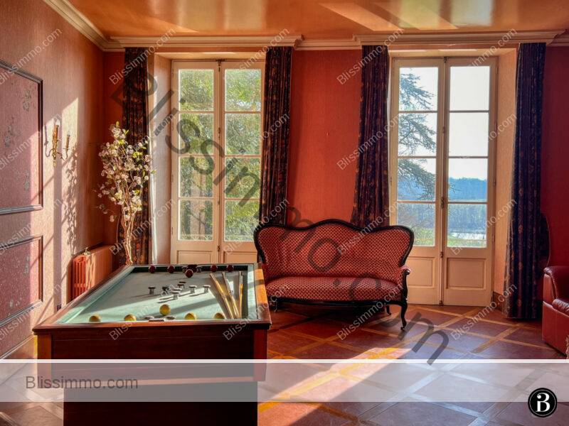 Here too, we can access the large terrace that runs the length of the front of the house, offering panoramic views of the château park and the valley. This is the ideal spot to sit and sip an aperitif in the evening and watch the birds swooping across the sky above the rolling hills.
