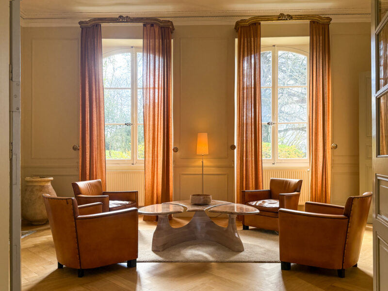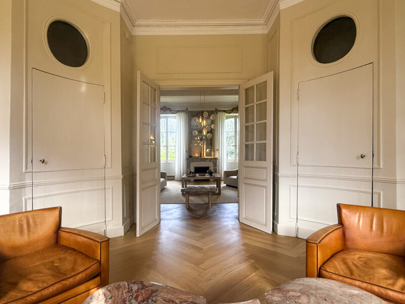 Derrière le salon, un grand séjour traversant, orné de parquets de chêne, de plafonds ouvragés et d’une cheminée Louis XVI, offrant une pièce où l’élégance du XVIIIe siècle se combine à la pierre sculptée d’une époque plus moderne.