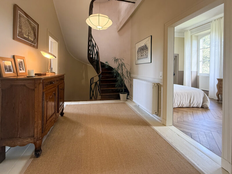 Le hall donne également accès à un superbe escalier en chêne menant à l’étage supérieur.