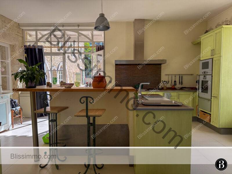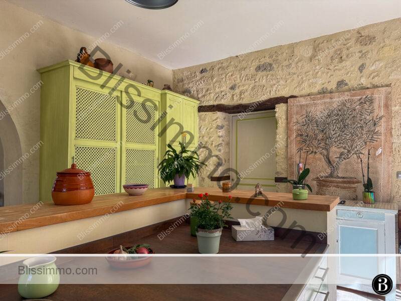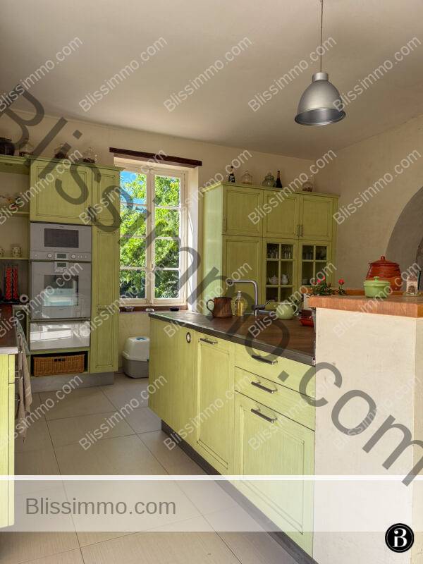 Derrière la salle à manger, on trouve une grande cuisine entièrement équipée, accompagnée d’une salle de petit-déjeuner et d’une cheminée, avec accès direct à la terrasse avant ainsi qu’aux zones piscine et sous-sol. Un WC invités et une petite buanderie complètent ce niveau.