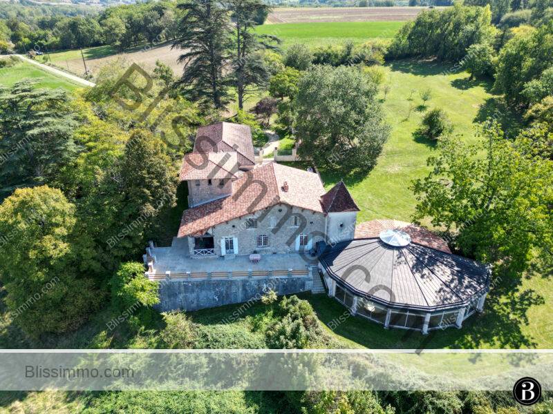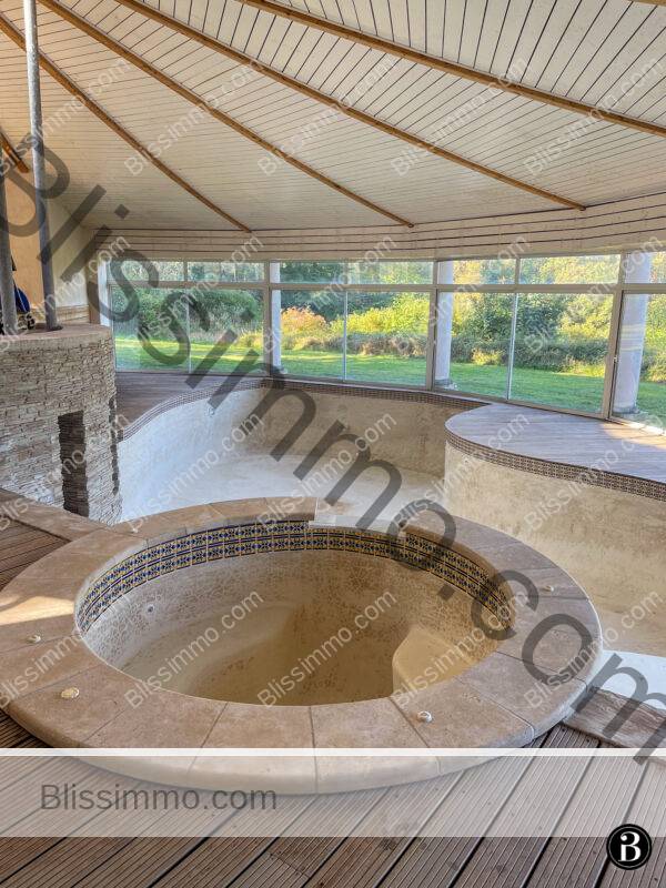 La piscine intérieure compte parmi les éléments les plus remarquables de la propriété. Conçue pour une utilisation tout au long de l’année, elle s’inspire de la Halle aux Grains d’Auvillar. La structure en éventail s’enroule autour d’un pilier central, enveloppant un superbe bassin aux courbes harmonieuses, doté d’un jacuzzi intégré. De grandes baies vitrées toute hauteur s’ouvre en été, transformant l’espace en véritable spa privé baigné de lumière. Une plateforme en surplomb offre l’endroit idéal pour installer une table de café ou des transats, renforçant l’atmosphère de luxe.