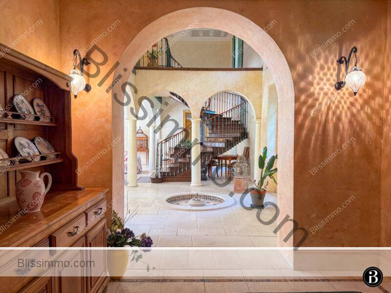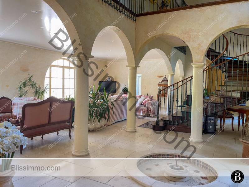 Le cœur de la maison est un immense salon principal de plus de 90 m², doté d’énormes fenêtres cintrées ouvrant sur la terrasse. La lumière y afflue et se reflète dans l’eau d’une charmante fontaine intégrée à la pièce ; associée à une série d’arches intérieures, elle confère à l’ensemble une atmosphère méditerranéenne.
