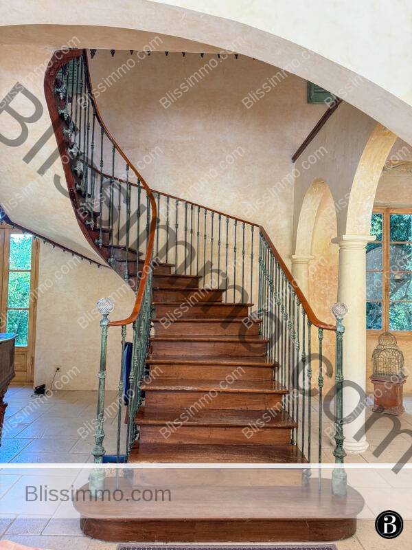 Un élégant escalier s’élève depuis le salon principal et se courbe pour atteindre le palier central du premier étage. On y trouve de hauts plafonds et un parquet ancien parfaitement poli.