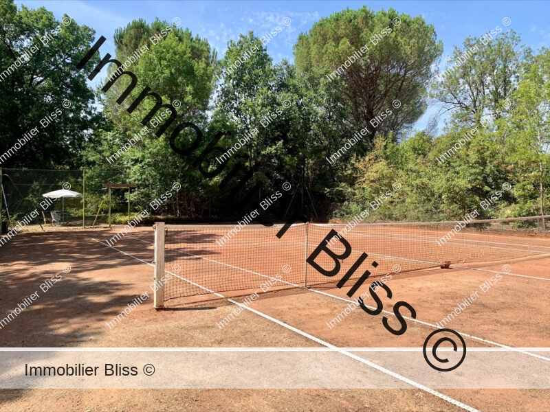 Derrière une haie discrète, la piscine est à peine visible, et l’on devine le court de tennis derrière un grillage vert.