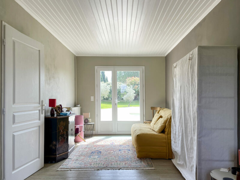 La façade impose une forme d’évidence : pierres, symétrie, lourde porte en bois : les codes de la maison gersoise sont là. Elle a de l’allure. Elle en impose sans ostentation.