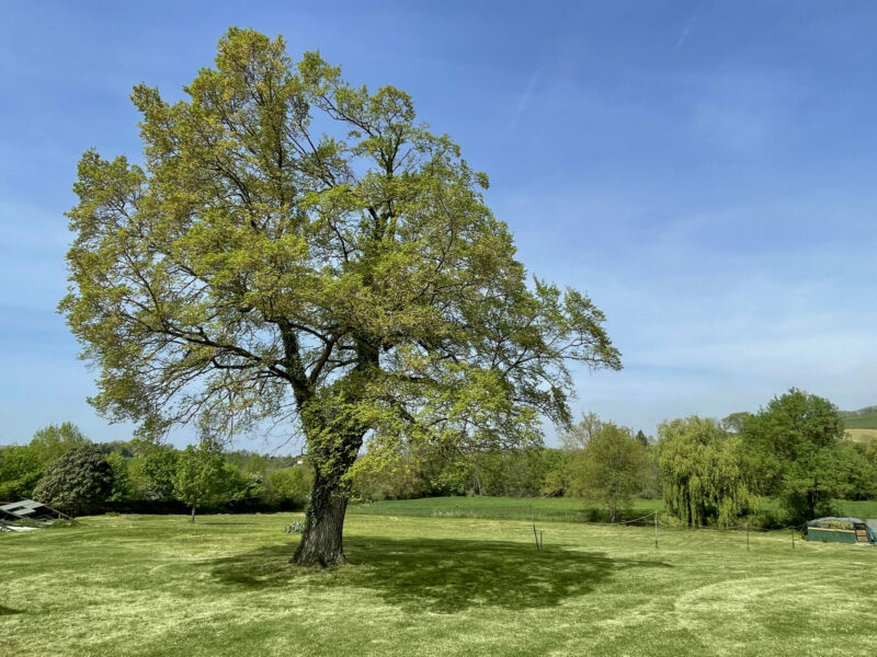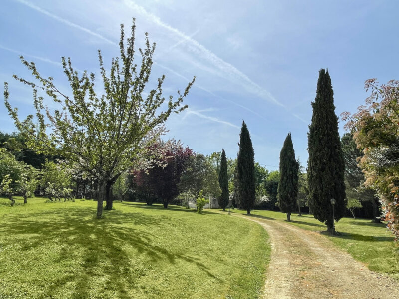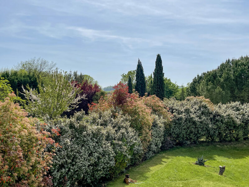 Autour, de magnifiques arbres : cyprès élancés, fruitiers généreux, haies foisonnantes, arbres centenaires. Puis la prairie qui s’étire, glisse lentement vers l’infini.