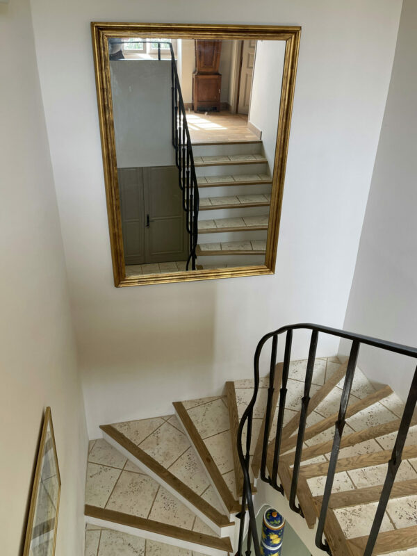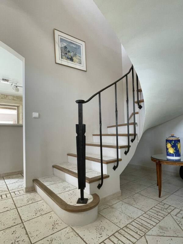 Une autre porte découvre un escalier à l’étonnante rampe en fer forgé. A l’étage, trois chambres. L’une avec sa propre salle de bains/toilettes. Les deux autres partageront une salle d’eau et des WC indépendants. Idéal quand on reçoit de la famille ou des amis.