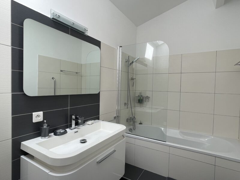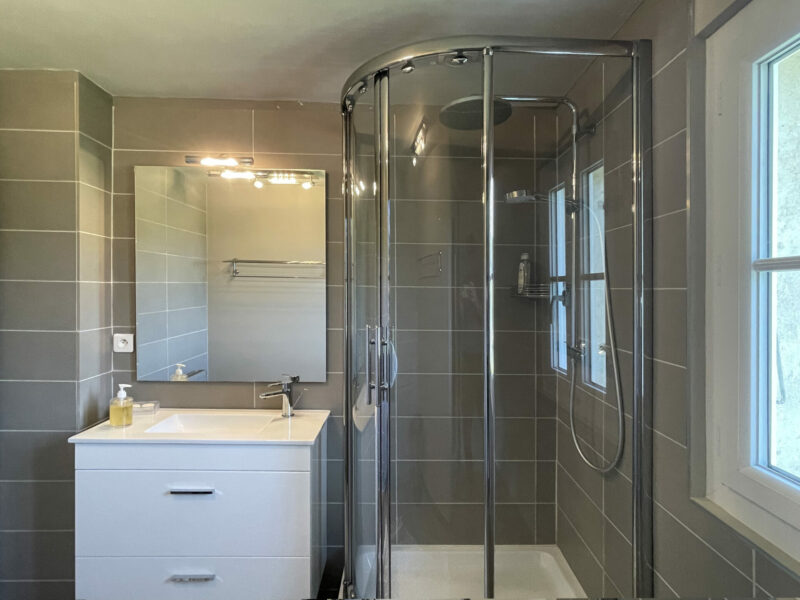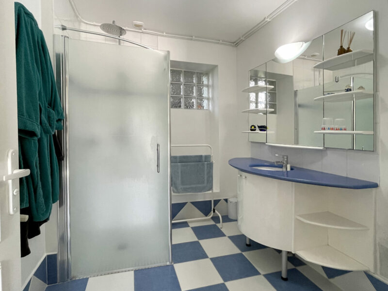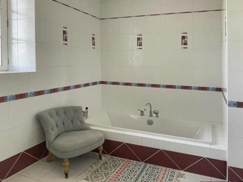 Redescendons et passons par la salle à manger. Un autre escalier nous emmène à un autre étage indépendant. Une très grande chambre, un dressing généreux, des toilettes séparées et une salle de bains avec sa grande baignoire et sa confortable douche à l’italienne. Le luxe !