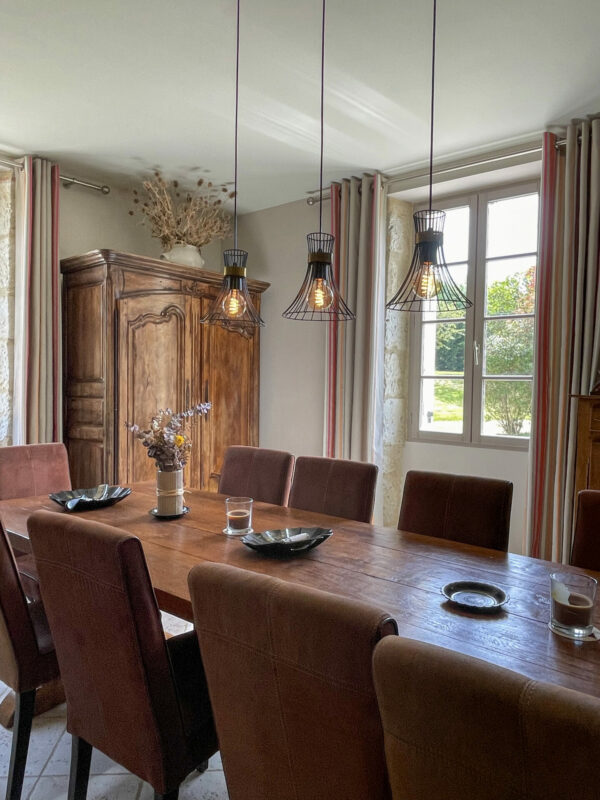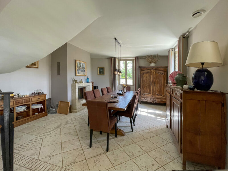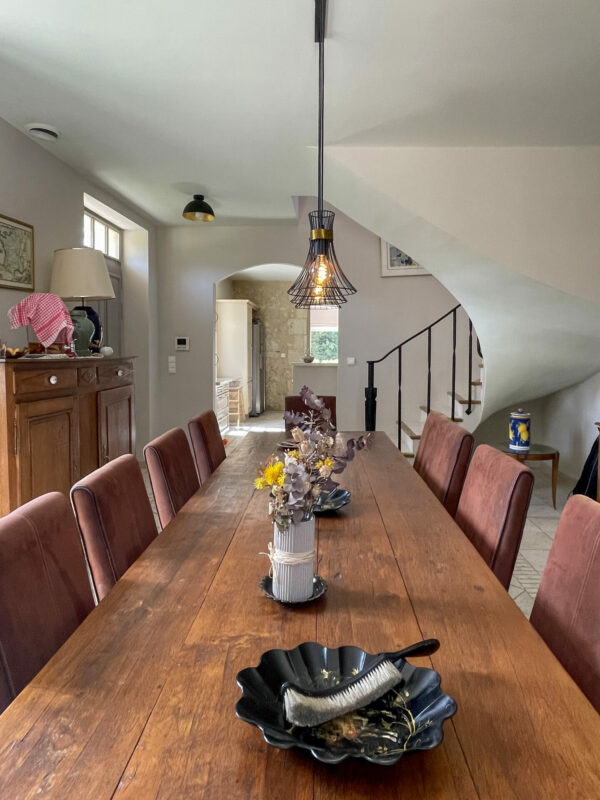 Les invités, eux, franchiront la porte principale, entrant directement dans la salle à manger. Elle est longue, propice à de grandes tablées devant le feu de cheminée. A gauche, la cuisine américaine.